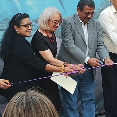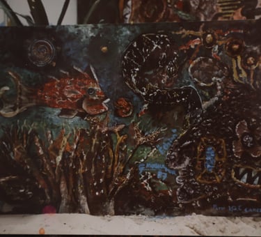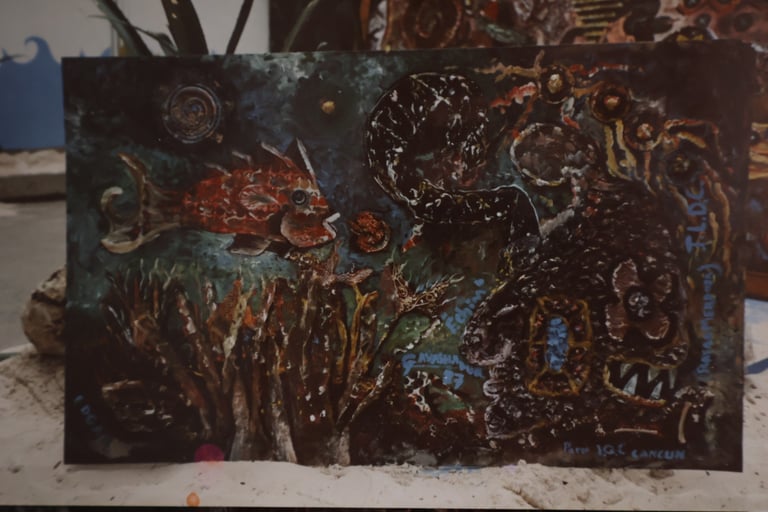 Collage colectivo. Título “Acuario”, "Nudos de víboras" expuestos en el vestíbulo del Palacio Municipal de Cancún Quintana Roo.